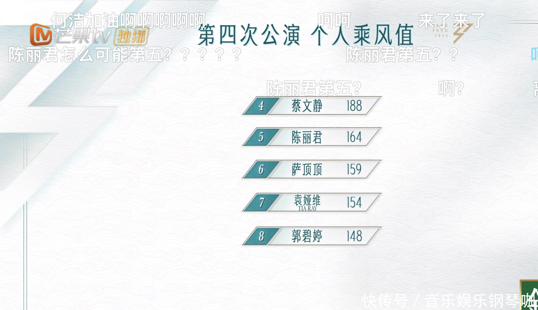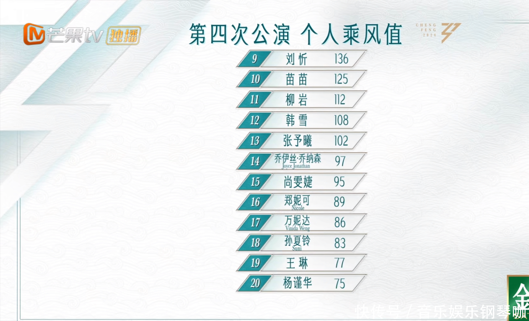 《乘风2024》五公组队播出,四公的个东谈主疼爱度公布,除了何洁第一让东谈主巧合之外,最让东谈主巧合的是尚雯婕第15,刘忻第九,而浪姐东谈主气最高的陈丽君也跌至第五。